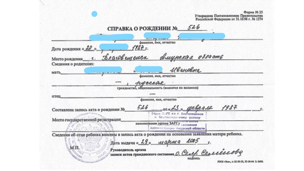 Свидетельство о рождении, справка по форме №25 (в случае записи сведений об отце ребенка в свидетельстве о рождении со слов матери ребенка)