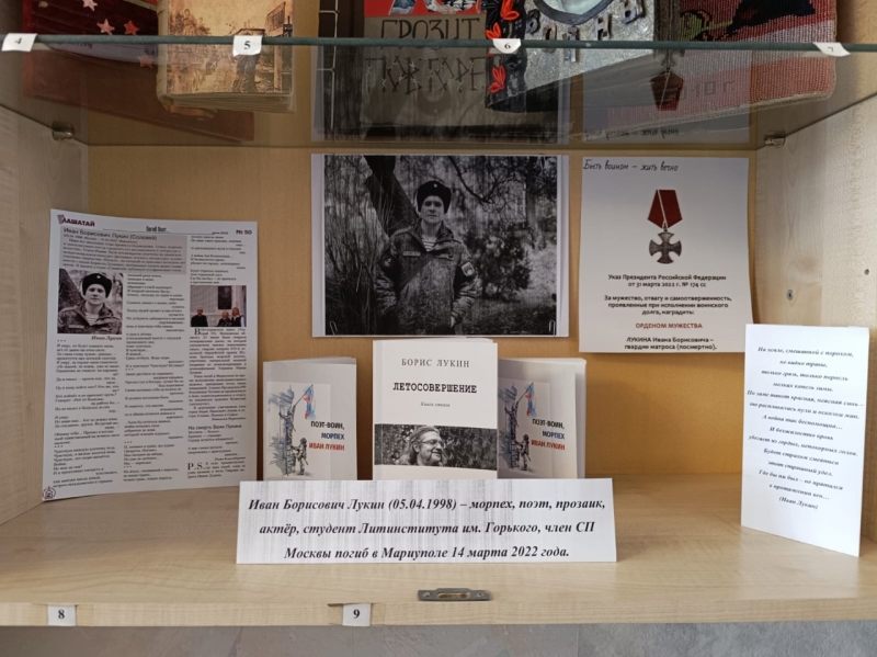 В предпраздничные дни в рамках тематической выставки "По литературным страницам российской истории" в музее открыт уголок Памяти Ивана Лукина, победителя литературных конкурсов фестиваля "Начало", поэта-воина, героически погибшего в ходе специальной военной операции, чья жизнь и судьба является "для ребят, что сейчас растут," примером беззаветной преданности Родине.