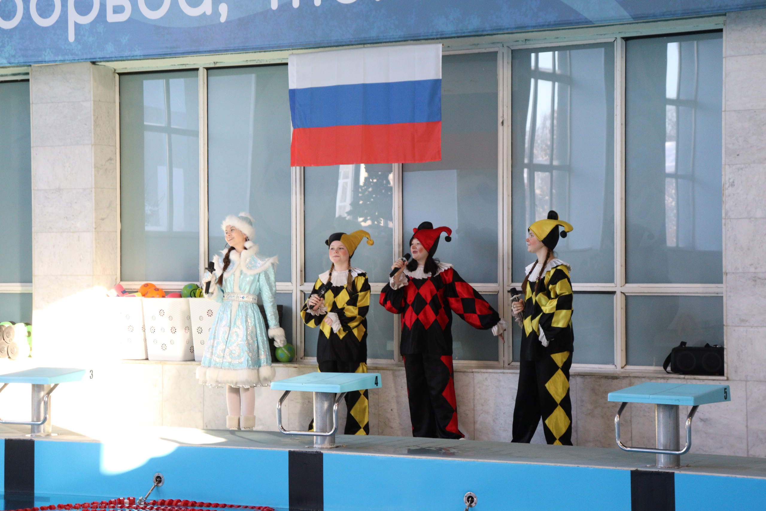 Всех гостей с прошедшими праздниками поздравили Дед Мороз, Снегурочка и озорные скоморохи, после чего тренеры по плаванию провели командную водную разминку. В соревнованиях приняли участие три сборные команды семей: «Метеоры», «Дельфины» и «Водные силачи». Все эстафеты были пройдены в атмосфере здорового соперничества и взаимоподдержки.
